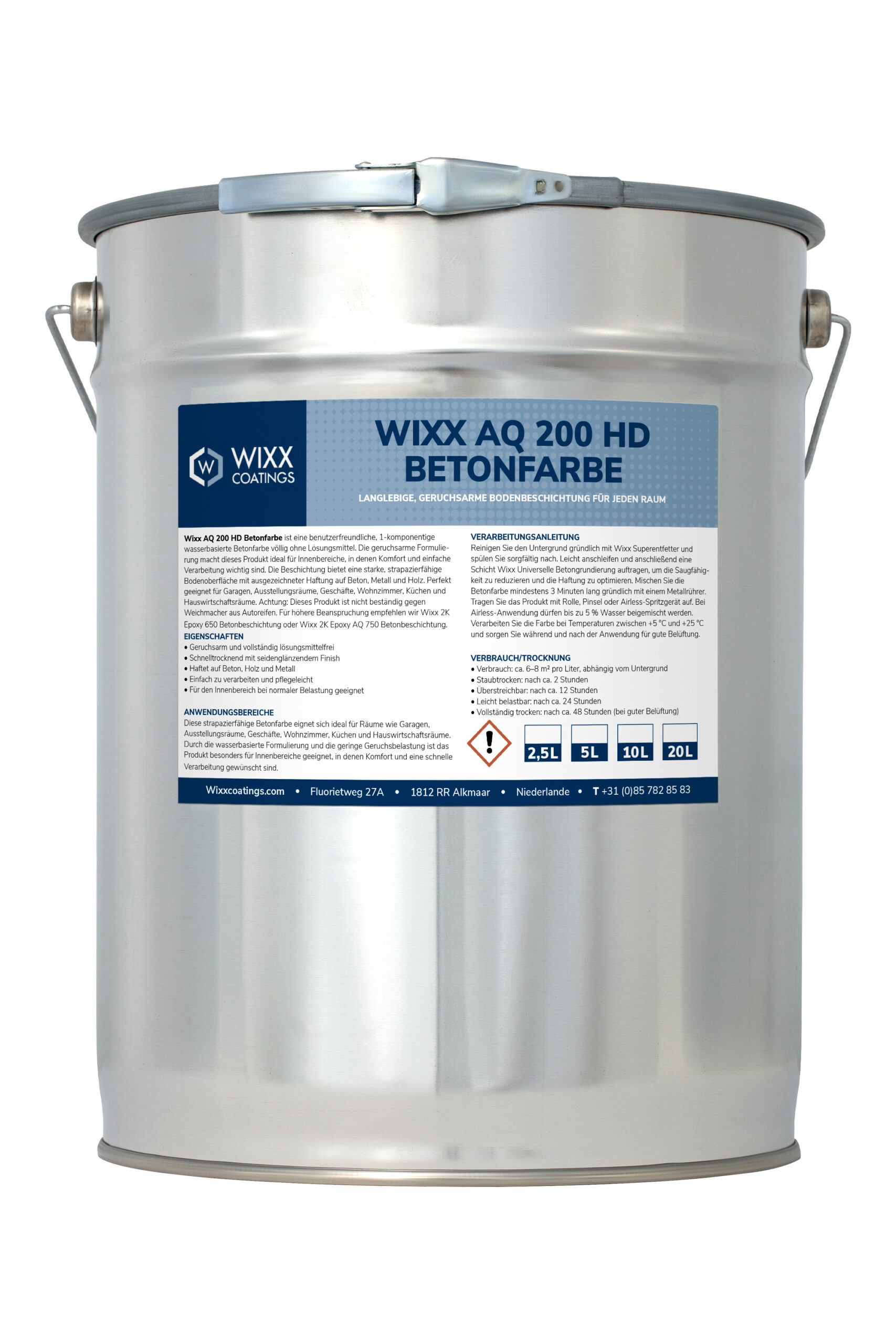 Wixx AQ 200 HD Beton farbe ist eine 1-Komponenten-, vollständig lösemittelfreie, wasserbasierte, geruchsarme und benutzerfreundliche Betonfarbe für verschleißfeste Bodenoberflächen. Die produktspezifische chemische Zusammensetzung resultiert nämlich in einer sicheren Verarbeitung und einer sehr guten verschleißfesten Bodenoberfläche mit ausgezeichneter Haftfestigkeit. Diese Beton farbe haftet zudem ausgezeichnet auf Metall und Holz. Ideal für Garagen, Verkaufsräume, Showrooms, Wohnzimmer, Küchen, Waschräume und vergleichbare Anwendungen. Dieses Produkt ist nicht gegen Weichmacher beständig.