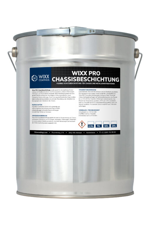 Wixx PRO Chassisbeschichtung wurde speziell für die Konservierung von Metallkonstruktionen wie Fahrgestellen von Fahrzeugen, Wohnwagen, Mobilheimen und Wohnmobilen entwickelt. Diese Beschichtung widersteht hervorragend Witterungseinflüssen und schwachen Säuren und Basen. Die Chassis-Beschichtung bietet langanhaltenden Schutz gegen Korrosion und Feuchtigkeit.