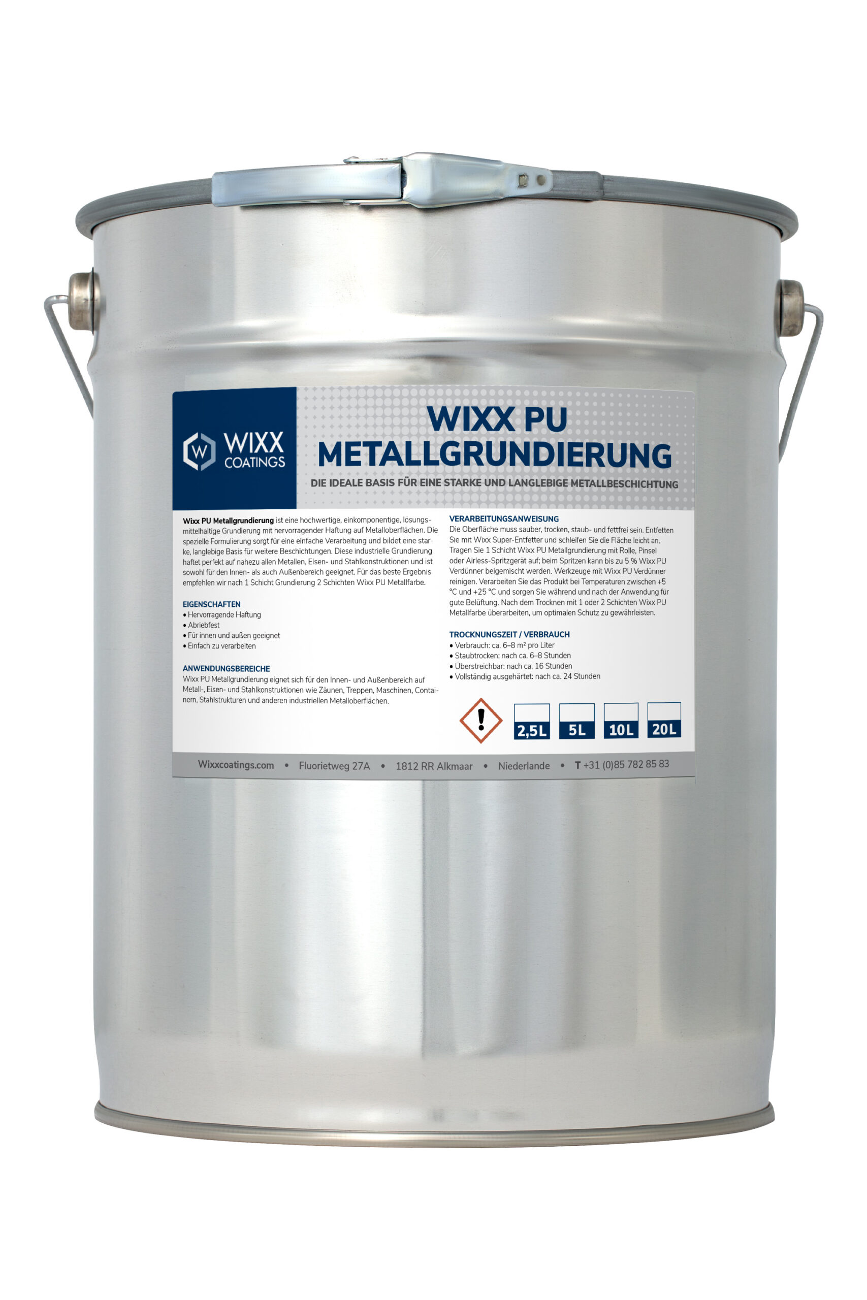 Wixx PU Metallprimer ist eine hochwertige 1-Komponenten, lösemittelhaltige und benutzerfreundliche Grundierung mit ausgezeichneter Haftfestigkeit. Diese Grundierung hat eine spezifische Zusammensetzung, die zu einer sicheren Verarbeitung und einem hohen Haftungswert führt. Daher ist dieser Wixx PU Metallprimer eine industrielle Grundierung, die sicher in der Anwendung ist. Nach 1 Schicht primer empfehlen wir anschließend 2 Schichten Wixx PU Metallfarbe für das optimale Ergebnis aufzutragen.