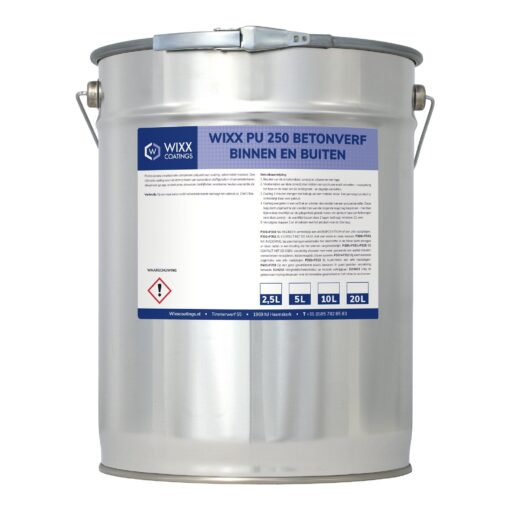 Wixx PU 250 betonverf buiten en binnen is een professionele één component polyurethaan coating die universeel toepasbaar is. Deze hoogwaardige betonverf buiten en binnen kenmerkt zich door extreme slijtvastheid en maakt stuivende en stoffige beton- of cementdekvloeren volledig stofvrij. Belangrijk: dit product is niet bestand tegen weekmakers van autobanden. Daarvoor adviseren wij de Wixx 2K 650 Extreme Betoncoating.
